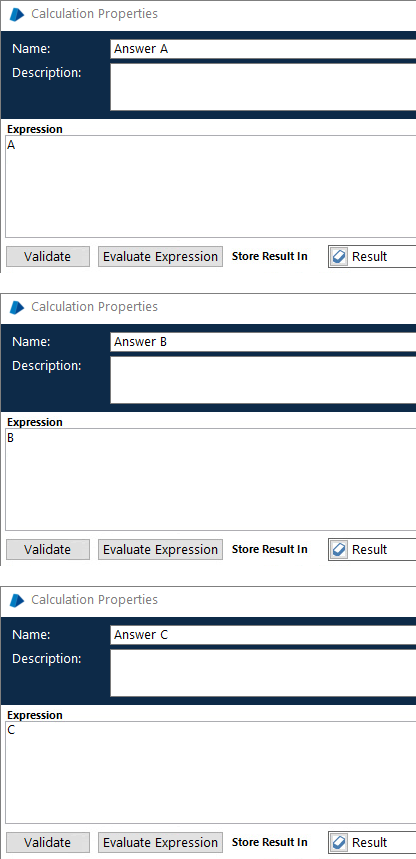 The Calculation stages will output A, B or C to the Result data item.