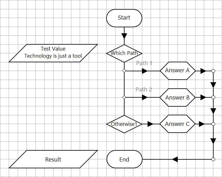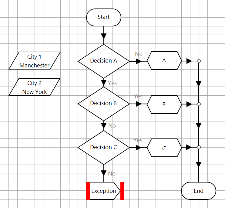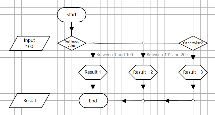 The Process flow is intended to test the value of the Input data item to determine if it falls within a range of numbers, and then assign a value as an output. The number ranges are defined as between 1 to 100, between 101 to 200, and anything outside these ranges.