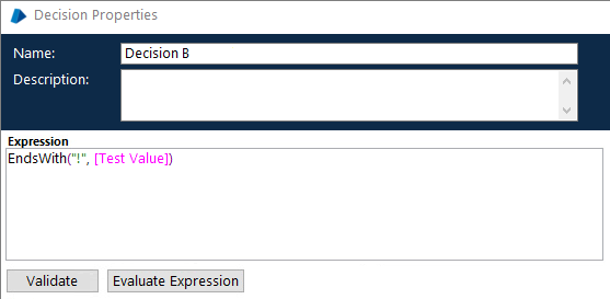 The ‘Decision B’ stage properties window is displayed below:
