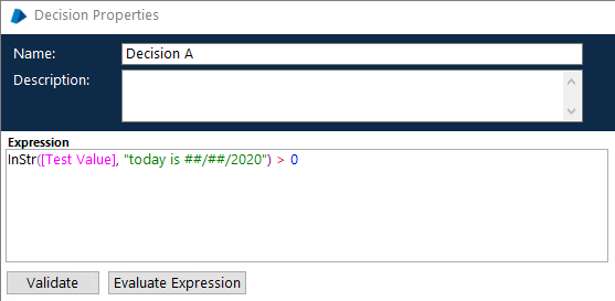 The ‘Decision A’ stage properties window is displayed below: