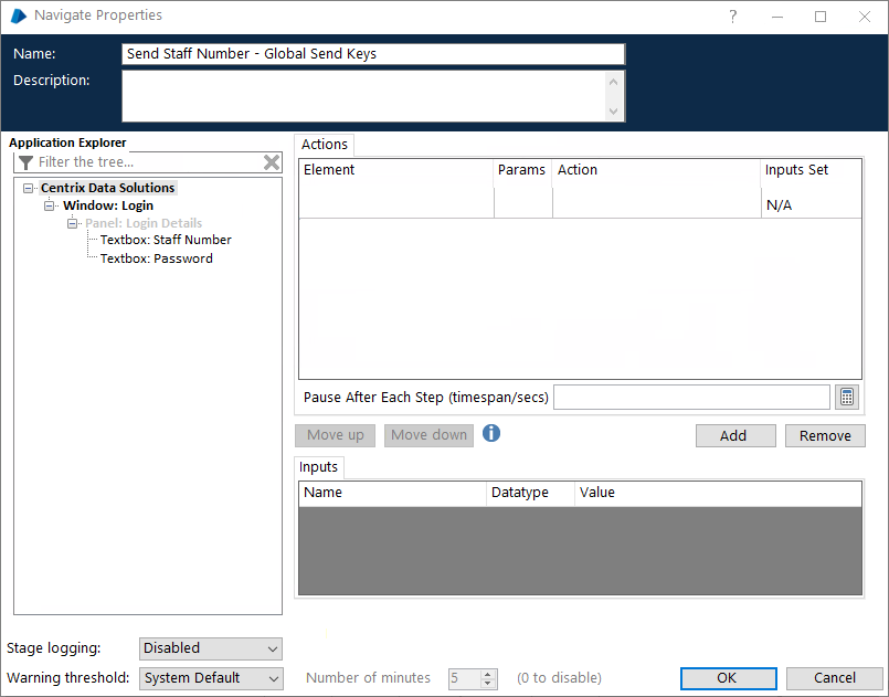 An Action in a Business Object needs to use Global Send Keys to populate the ‘Staff Number’ field in an application called Centrix Data Solutions. The application is in focus and the cursor is placed in the Staff Number field.