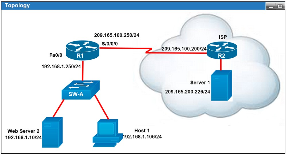 Refer to the topology. The diagram represents a small network with a single connection to the Internet.