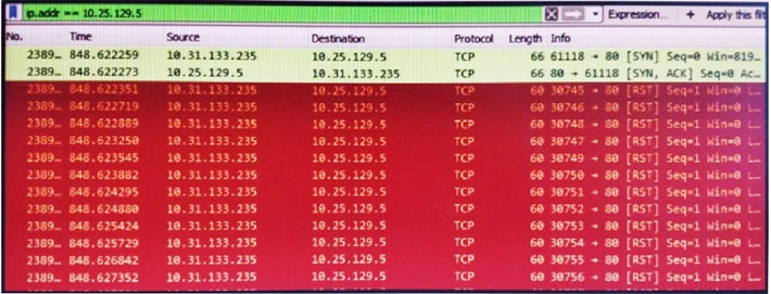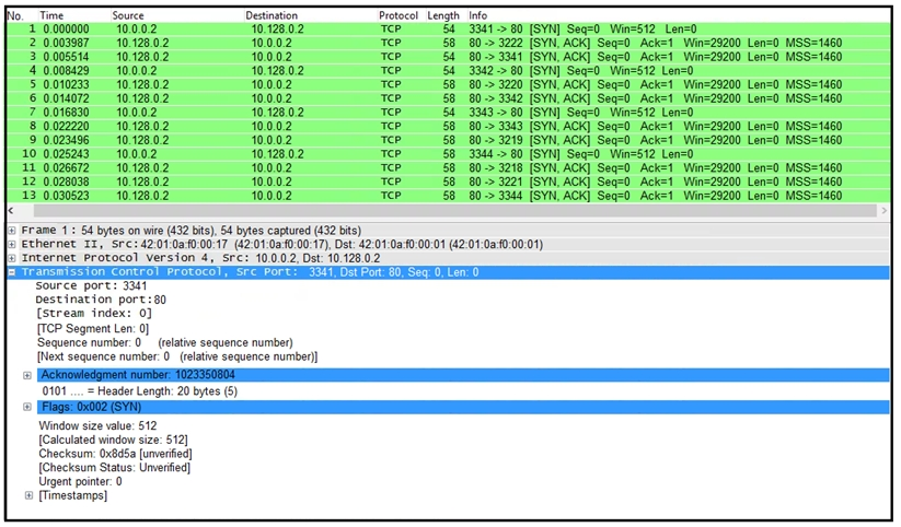 3. A high rate of SYN packets being sent from a single source IP toward multiple destination IPs