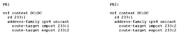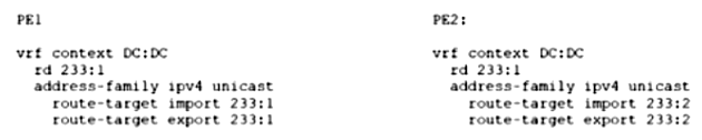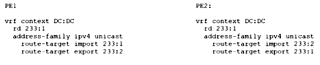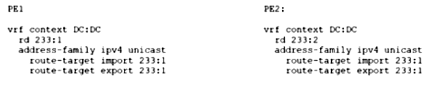 An engineer must add a new VRF (DC:DC) to the network that runs with Multiprotocol Border Gateway Protocol (MP-BGP) and EVPN. The requirement for the new VRF is to allow communication of network prefixes between PE1 and PE2. Which two sets of steps should be taken to complete the VRF configuration? (Choose two.)