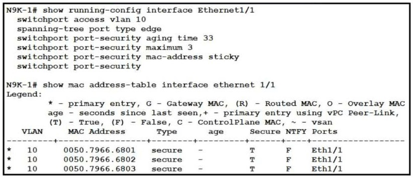 Refer to the exhibit. An engineer configures port security on a Cisco Nexus 9000 Series Switch. The requirement is to prevent any newly learned MAC addresses from forwarding traffic on the interface. Also, the already learned MAC addresses must not be affected by the changes. Which configuration meets these requirements?
