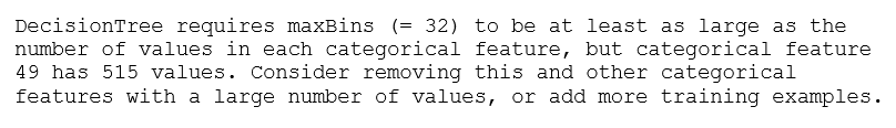 During the training process following this conversion, they receive the following error describing that need to set the maxBins parameter to at least 515 (or remove the feature):