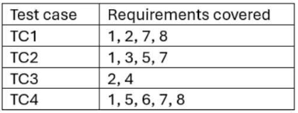You prioritize test cases using the additional coverage prioritization technique, using the requirements coverage as a coverage measure. All four test cases must be executed. The coverage achieved by your test cases is shown in the table below.