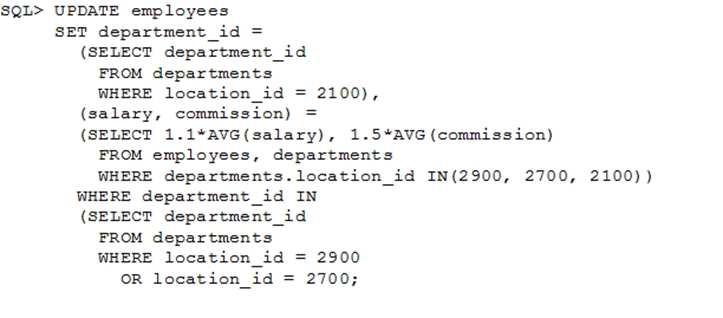 • Set the employees' salary in location_id 2100 to 1.1 times the average salary of their department.