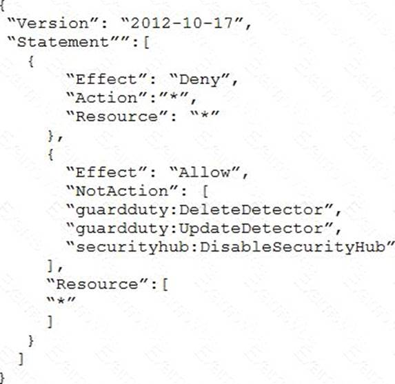 A company deploys a set of standard IAM roles in AWS accounts. The IAM roles are based on job functions within the company. To balance operational efficiency and security, a security engineer implemented AWS Organizations SCPs to restrict access to critical security services in all company accounts. All of the company's accounts and OUs within AWS Organizations have a default FullAWSAccess SCP that is attached. The security engineer needs to ensure that no one can disable Amazon GuardDuty and AWS Security Hub. The security engineer also must not override other permissions that are granted by IAM policies that are defined in the accounts. Which SCP should the security engineer attach to the root of the organization to meet these requirements?