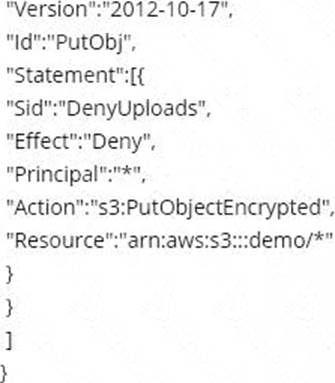 Which of the following bucket policies will ensure that objects being uploaded to a bucket called 'demo' are encrypted.