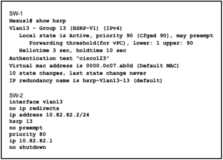 Refer to the exhibit. A recent configuration change removes the HSRP adjacency between the SW-1 and SW-2 Cisco Nexus switches. The change causes the servers on this subnet to lose Internet access. Which action restores the connectivity of all servers on VLAN 13?