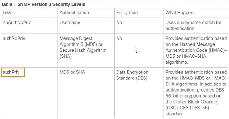 Which SNMPv3 configuration must be used to support the strongest security possible?