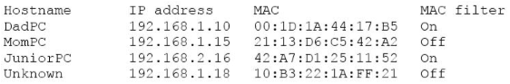 A user suspects someone has been accessing a home network without permission by spoofing the MAC address of an authorized system. While attempting to determine if an authorized user is logged into the home network, the user reviews the wireless router, which shows the following table for systems that are currently on the home network.