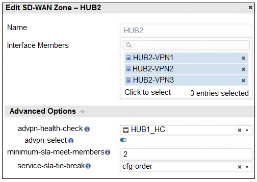 3. The configuration instructs FortiGate to establish shortcuts only when at least two members meet the SLA target.