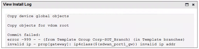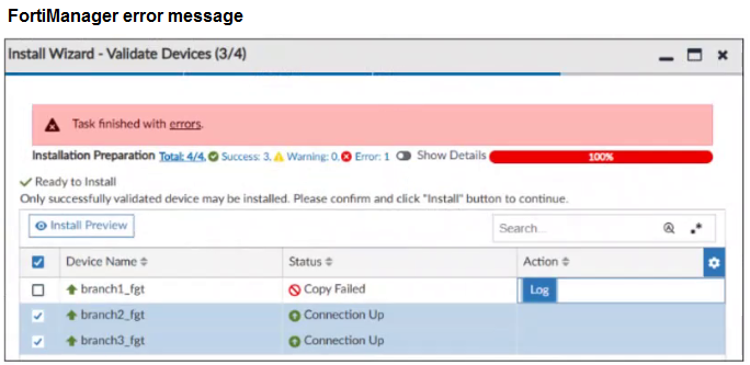 When you install the device settings, FortiManager prompts you with the error “Copy Failed” for the device branch1_fgt. When you click the log button, FortiManager displays the message shown in the exhibit.