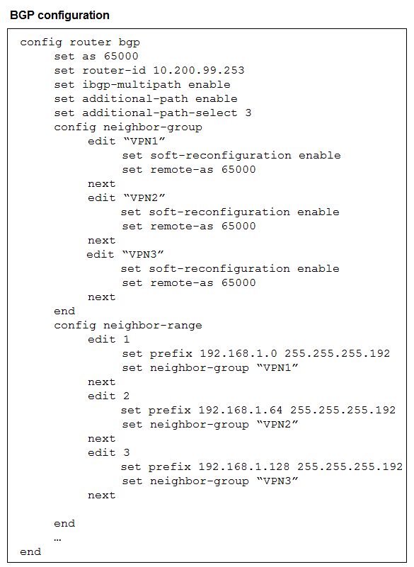 The exhibit shows the BGP configuration on the hub in a hub-and-spoke topology. The administrator wants BGP to advertise prefixes from spokes to other spokes over the IPsec overlays, including additional paths. However, when looking at the spoke routing table, the administrator does not see the prefixes from other spokes and the additional paths