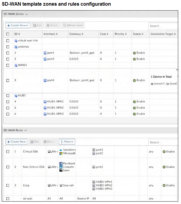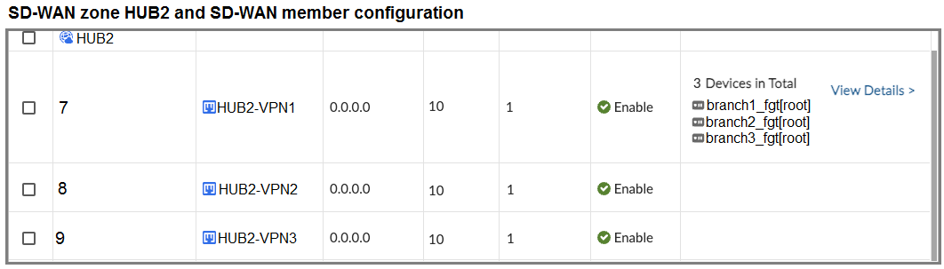 You use FortiManager to configure SD-WAN on three branch devices.