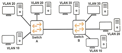 How should the network administrator configure the link between Switch A and Switch B to ensure that all hosts can communicate to all the other hosts within their respective VLANs?