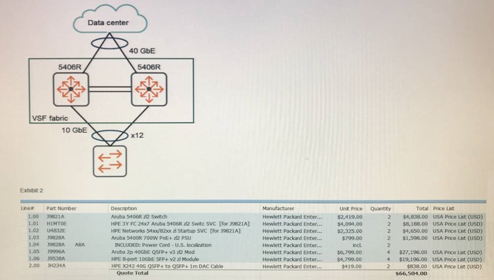 Exhibit 1 shows the logical plan, and Exhibit 2 shows the BOM created with IRIS. An architect plans to propose two 5406Rzl switches as a VSF fabric for a campus network core. Which issue with the plan should the architect correct?