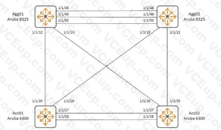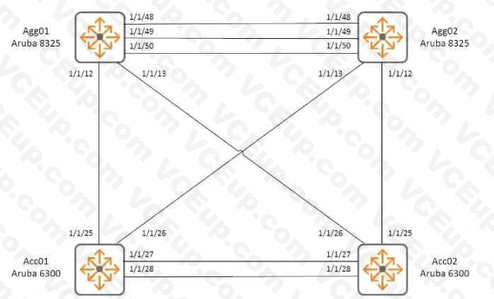 An engineer has attempted to configure two pairs of switches m the referenced configuration it Is required to implement Multi-Chassis Link Aggregation for each pair of switches The ports of the Aruba 8325 switches used for Agg01 and Agg02 are populated as follows