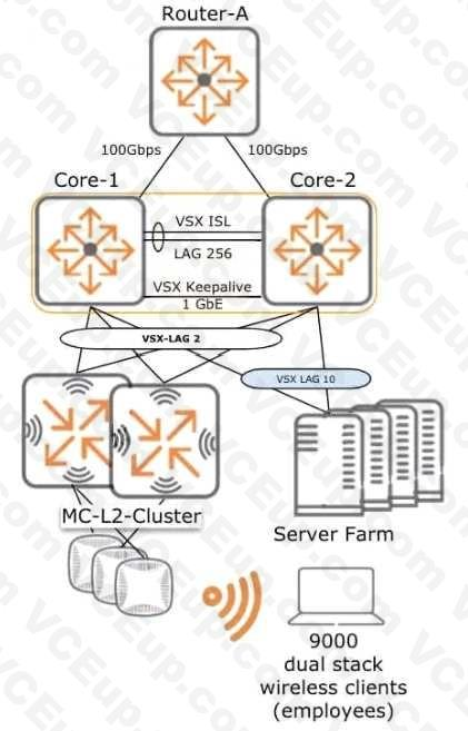 The customer is considering Implemented the following VSX configuration that will host an Aruba mobility cluster servicing 9000 dual stack employee devices.