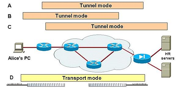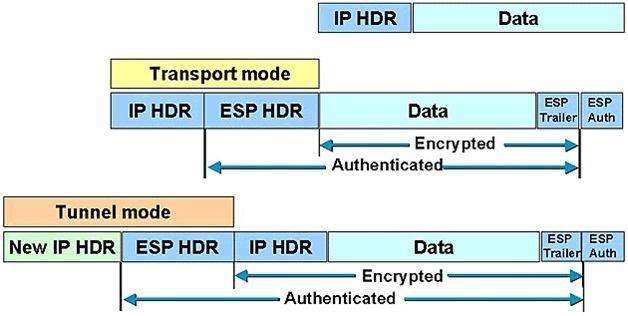 Figure 3 above shows the differences that the IPSec mode makes to ESP. In transport mode, the IP payload is encrypted and the original headers are left intact. The ESP header is inserted after the IP header and before the upper-layer protocol header. The upper-layer protocols are encrypted and authenticated along with the ESP header. ESP doesn't authenticate the IP header itself.