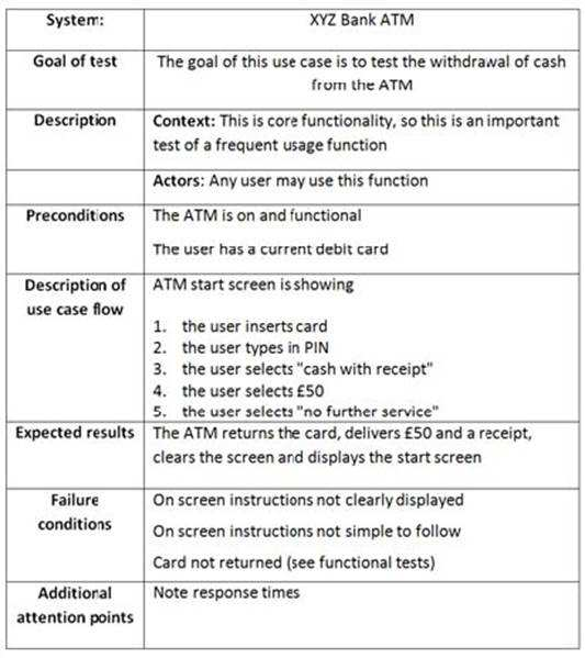 The use case will be used as a basis for the design of usability test scenario’s. As a tester you are asked to review the ATM use case from the perspective of usability testing.