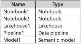Lakehouses, data pipelines, and notebooks must be stored in WorkspaceA. Semantic models, reports, and dataflows must be stored in WorkspaceB.