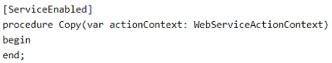 The IT department creates a custom API for exposing the custom Issue table. The API provides an action for copying an issue to a new table. The action is defined as follows: