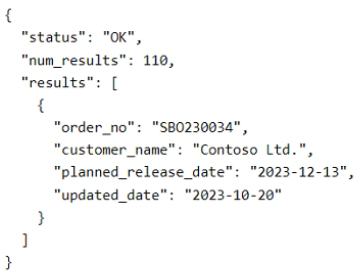 The API for retrieving the order no. and planned release date of each subcontracting order responds with the following JSON: