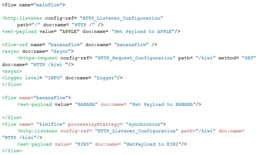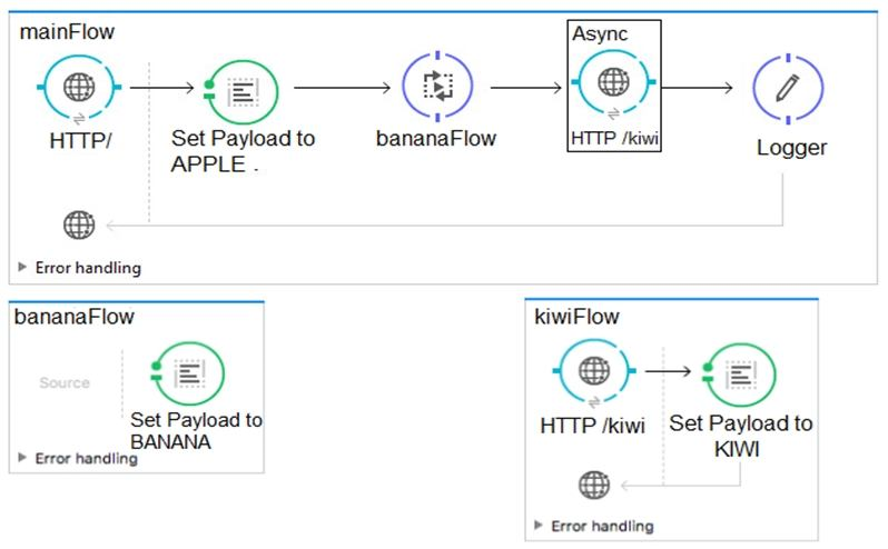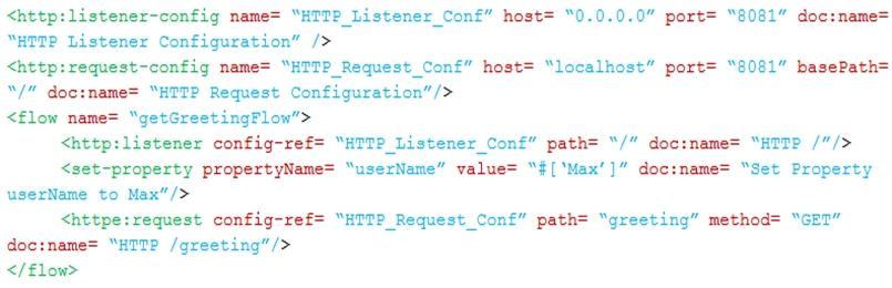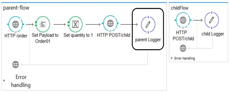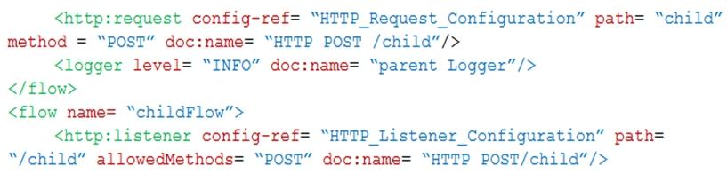 Refer to the exhibits. The parentFlow contains an HTTP Request in the middle of the flow. The HTTP Listeners and HTTP Request use default configurations.