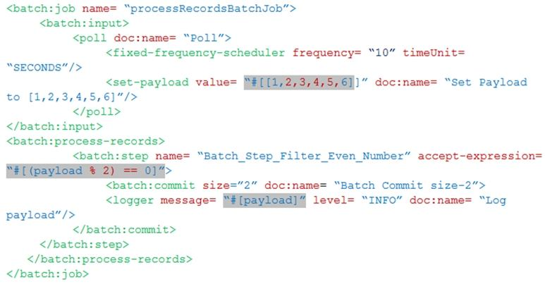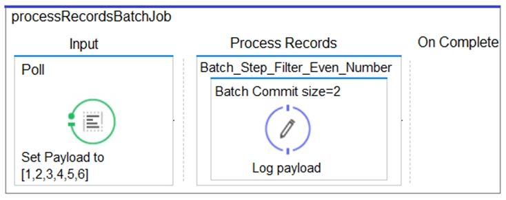 Refer to the exhibits. The Batch Job processes, filters, and commits records. What is the expected output from the Logger component when this Mule application runs?