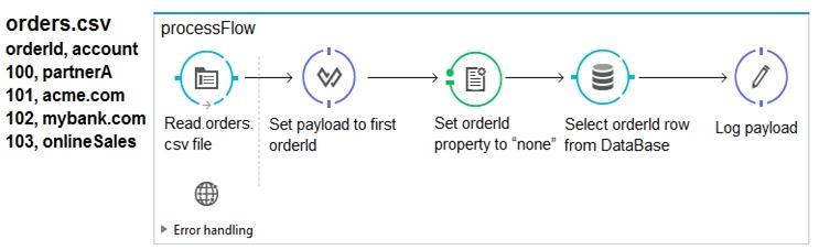 Refer to the exhibit. The orders.csv file is read, then processed to look up the orders from the database. The Mule application is debugged in Anypoint Studio and stops at the breakpoint. What is the payload shown in the debugger at this breakpoint?