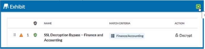 The issue described in the exhibit is that banking websites are still being inspected despite creating an SSL decryption policy to bypass the inspection of financial and accounting web categories.Possible Causes:An incorrect category has been selected (Option B):If the SSL decryption policy is configured to bypass the wrong category (e.g., not the actual financial and accounting category), it won't effectively exclude banking websites from inspection.An incorrect action has been specified (Option D):If the action specified in the policy is not set to ''Bypass,'' it won't achieve the desired behavior. The policy should explicitly bypass SSL inspection for the selected category.Solution:Verify that the correct category (financial and accounting) is selected in the policy, and ensure that the action is set to ''Bypass.''