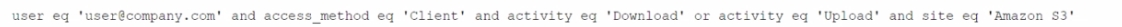 1. The query returns all events of [email protected] downloading or uploading to or from the site 'Amazon S3' using the Netskope Client.