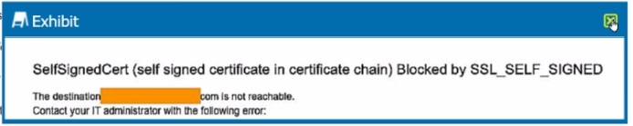 You are the proxy administrator for a medical devices company. You recently changed a pilot group of users from cloud app steering to all Web traffic. Pilot group users have started to report that they receive the error shown in the exhibit when attempting to access the company intranet site that is publicly available. During troubleshooting, you realize that this site uses your company's internal certificate authority for SSL certificates.