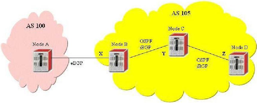 Node A has an active BGP route 10.1.1.1 in its routing table, but the same route is not found in Node D routing table.