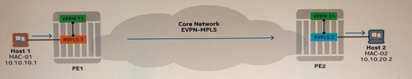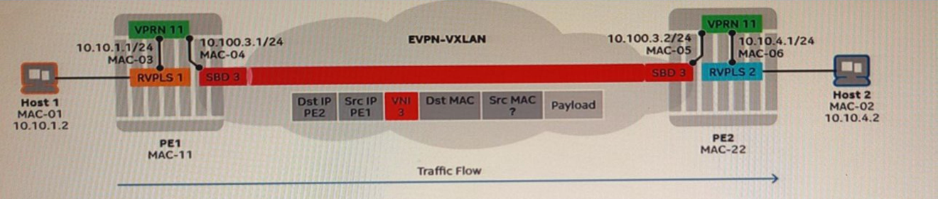 MAC-01 is used as the source MAC address in the packets sent from PE1 when forwarding customer traffic to Host 2.MAC-01 is the MAC address of the SBD IRB interface configured in VPRN 11 on PE12.