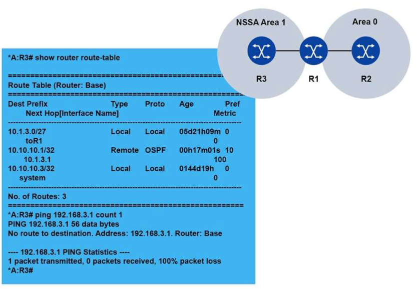 192.168.3.1 is a loopback interface configured into router R2's OSPF area 0. A ping from router R3 to this loopback fails.