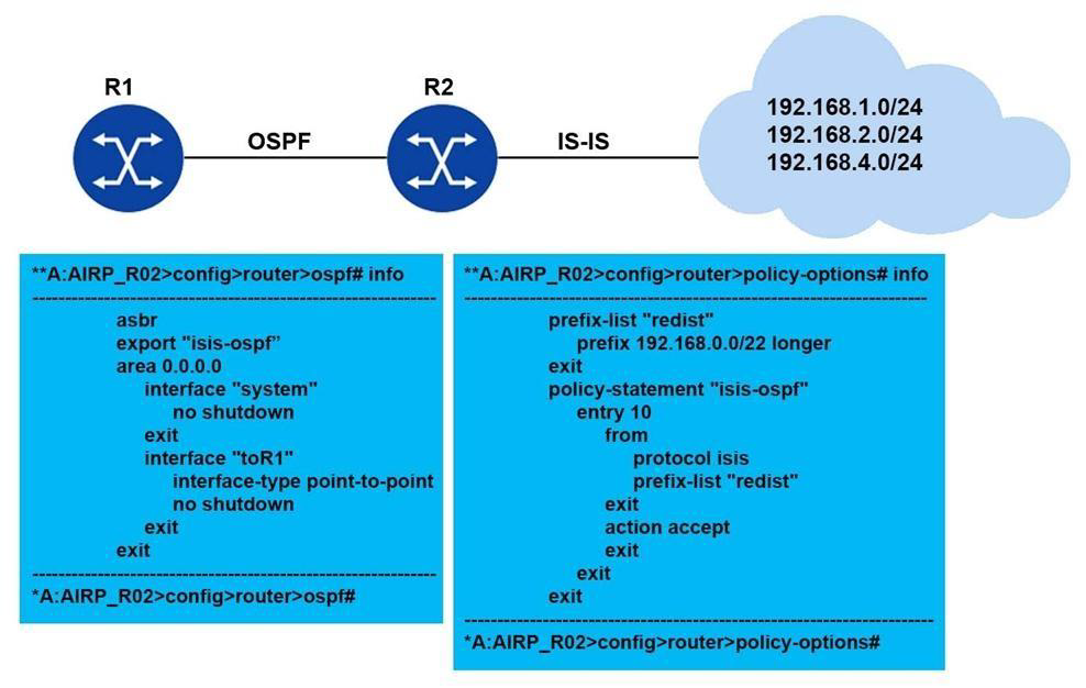 Router R2 learns the networks shown from IS-IS. Router R2 is configured to redistribute routes from IS-IS to OSPF as shown. How many OSPF Type 5 LSAs will router R1 receive from router R2? Assume the OSPF and IS-IS adjacencies are operational.