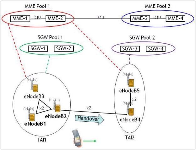 Based on the information shown in the exhibit, what type of handover is performed when the UE moves from eNodeB2 to eNodeB4?