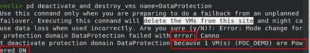 The customer then runs the following command on Site A: ncli pd deactivate_and__destroy_vms name=<protection_domain_name> What does this do to the customer environment?