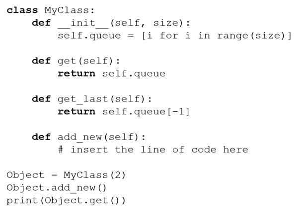 Which of the following lines of code will work flawlessly when put independently inside the add_new() method in order to make the snippet's output equal to [0, 1, 2]? (Choose two.)