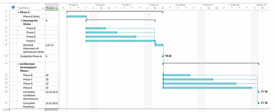 Each phase is dependent on the outputs of the previous phase and the Requirements Management phase runs throughout. The Gantt chart clearly shows the dependency and sequence in which these phases occur, implying that a structured approach is followed to produce the enterprise architecture.