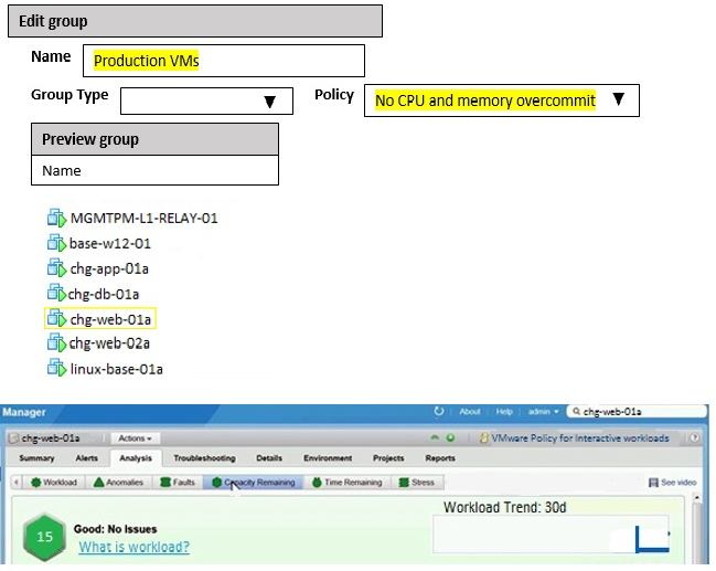The VM chg-web-01a is a member of several Custom Groups including the “Production VMs” Custom Group. The “Production VMs” Custom Group is associated with the “No CPU and memory overcommit” Policy.